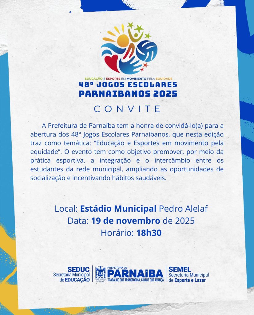 A Prefeitura de Parnaíba, por meio das Secretarias Municipais de Educação e Esporte e Lazer, vai realizar (19/11) nesta quarta-feira a solenidade de abertura oficial dos 48º Jogos Parnaibanos 2026, com início às 18h30min e a participação de 54 escolas municipais, estaduais e da rede privada de ensino.