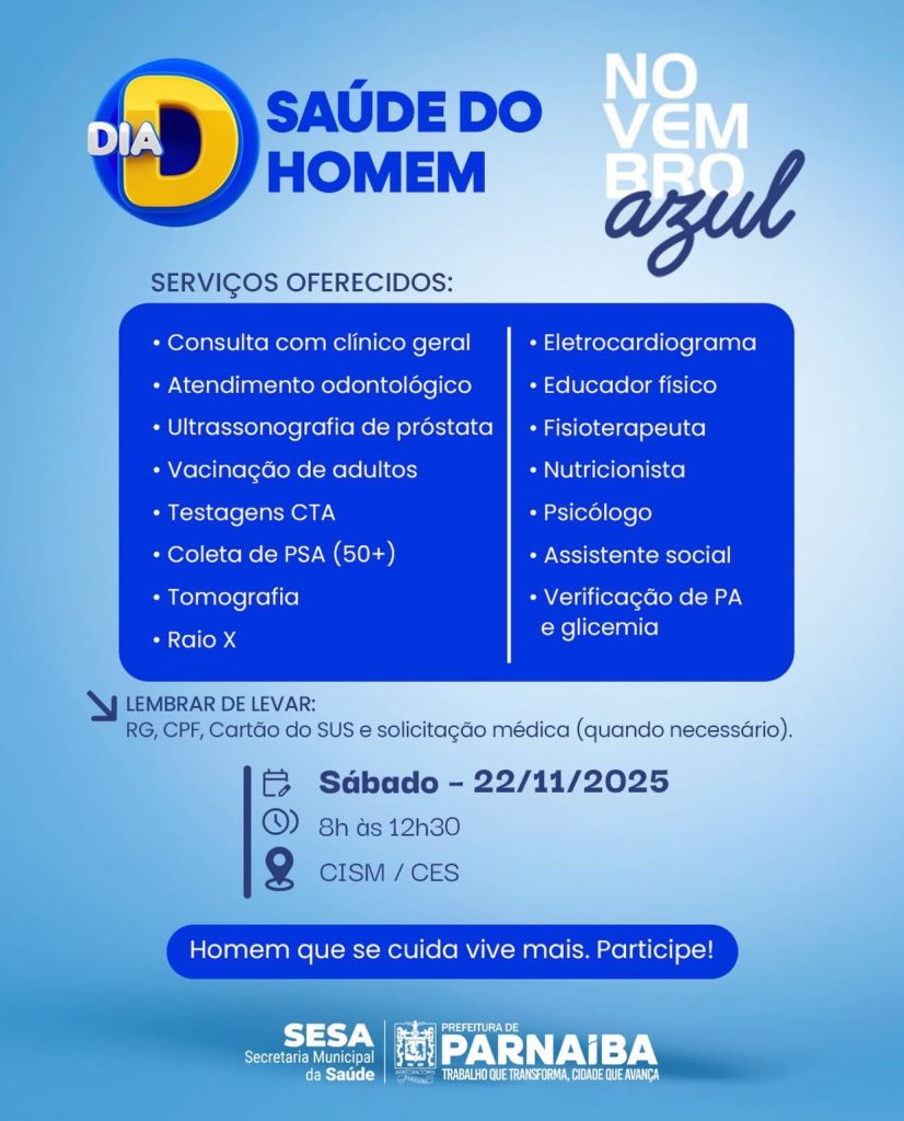 A Prefeitura de Parnaíba, por meio da Secretaria Municipal de Saúde, vai realizar uma importante ação da campanha do Novembro Azul, no dia 22 de novembro de 2025, o Dia D da Saúde do Homem.