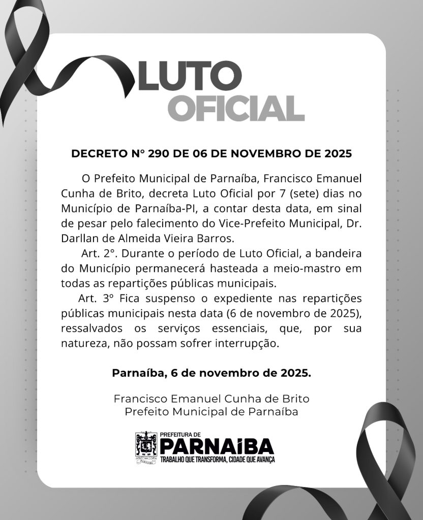 O Prefeito Francisco Emanuel assina o decreto nº 290 de 6 de Novembro de 2025, que trata  do Luto Oficial por sete (7) dias no Município de Parnaíba, a contar desta data, em pesar pelo falecimento do Vice-Prefeito Municipal, Dr. Darllan de Almeida Vieira Barros.