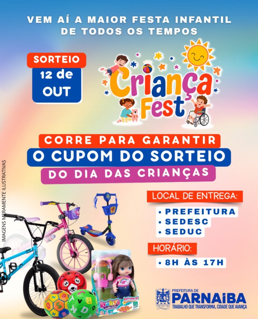 Os cupons para o sorteio estão sendo entregues na sede da Prefeitura de Parnaíba, SEDESC (Secretaria Municipal de Desenvolvimento Social e Cidadania) e SEDUC (Secretaria Municipal de Educação), das 8h às 17h.