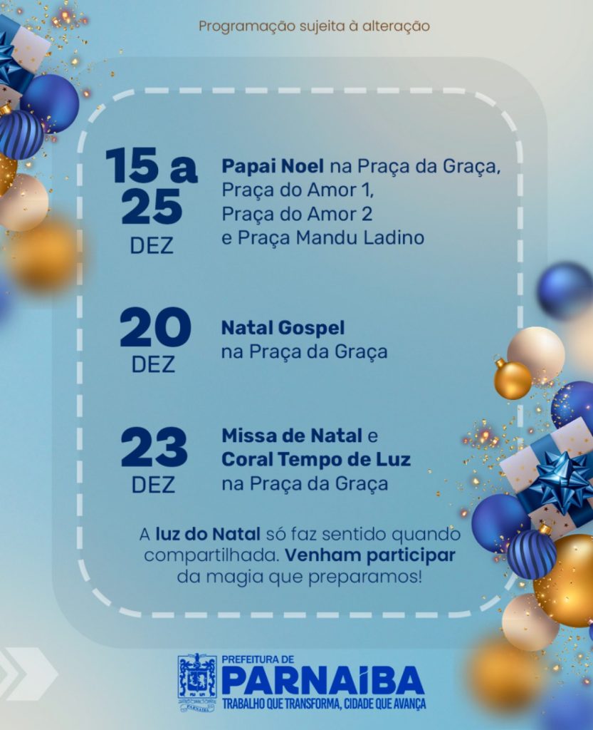 Lembre-se: A luz do Natal só faz sentido quando compartilhada. Venham participar da magia que a Prefeitura de Parnaíba prepara para dezembro de 2025.