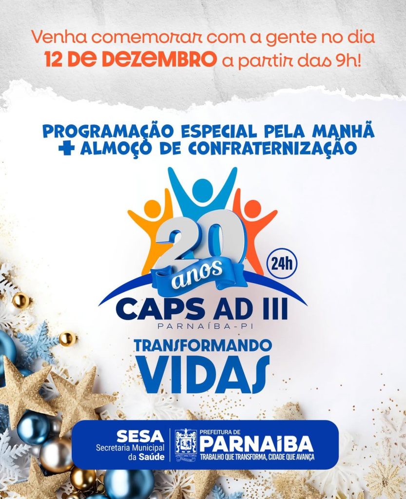 A Prefeitura de Parnaíba, por meio da Secretaria Municipal de Saúde, vai realizar uma programação especial com almoço de confraternização para comemorar os 20 anos de CAPS AD III, no dia 12 de dezembro de 2025.