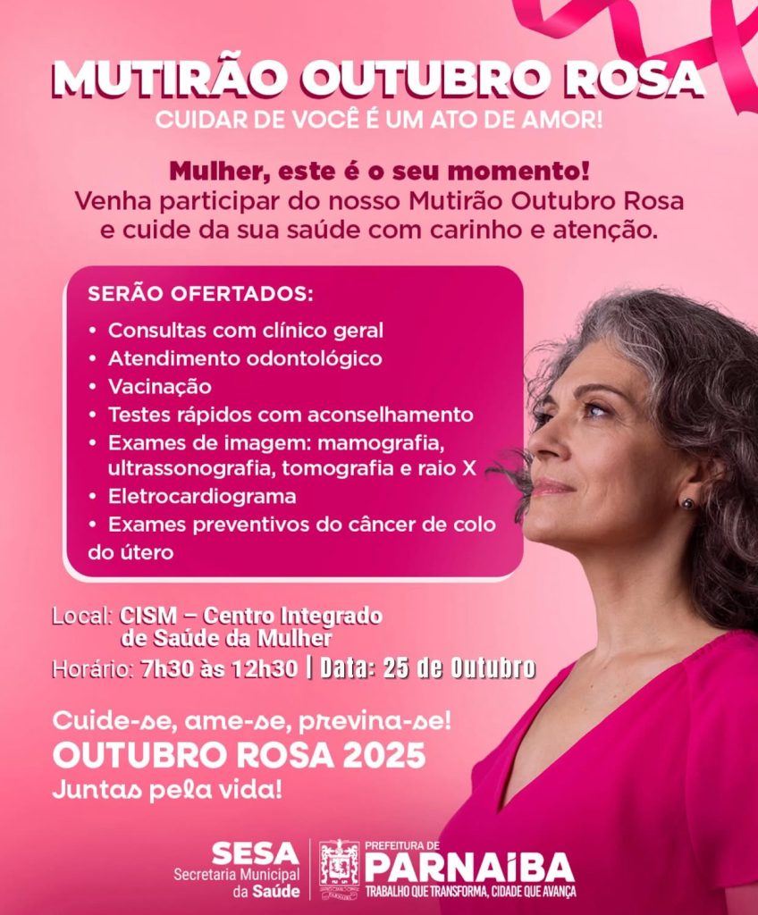 A Prefeitura de Parnaíba, por meio da Secretaria Municipal de Saúde, vai realizar no dia 25 de outubro de 2025, das 7h30min às 12h30min, o Mutirão Outubro Rosa no Centro Integrado de Saúde da Mulher (CISM).