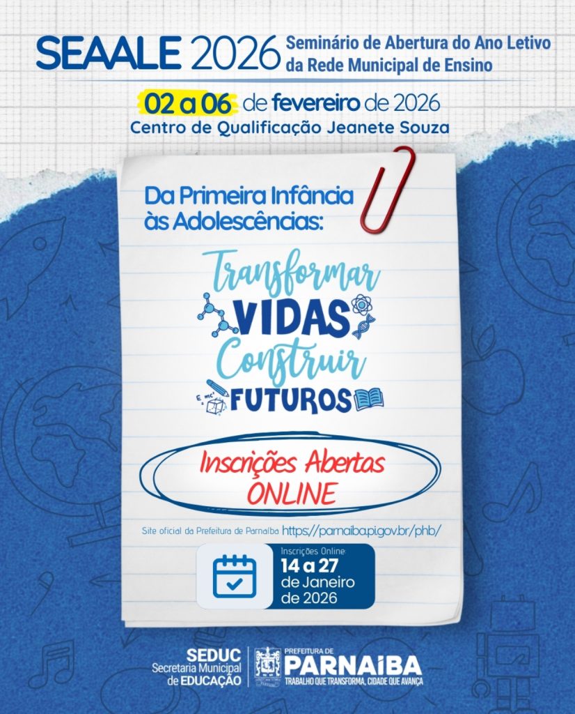 A Prefeitura de Parnaíba, por meio da Secretaria Municipal de Educação, vai realizar o SEAALE 2026 – Seminário de Abertura do Ano Letivo da Rede Municipal de Ensino de Parnaíba, nos dias 02 a 06 de fevereiro, no Centro de Qualificação Jeannete de Moraes Souza.